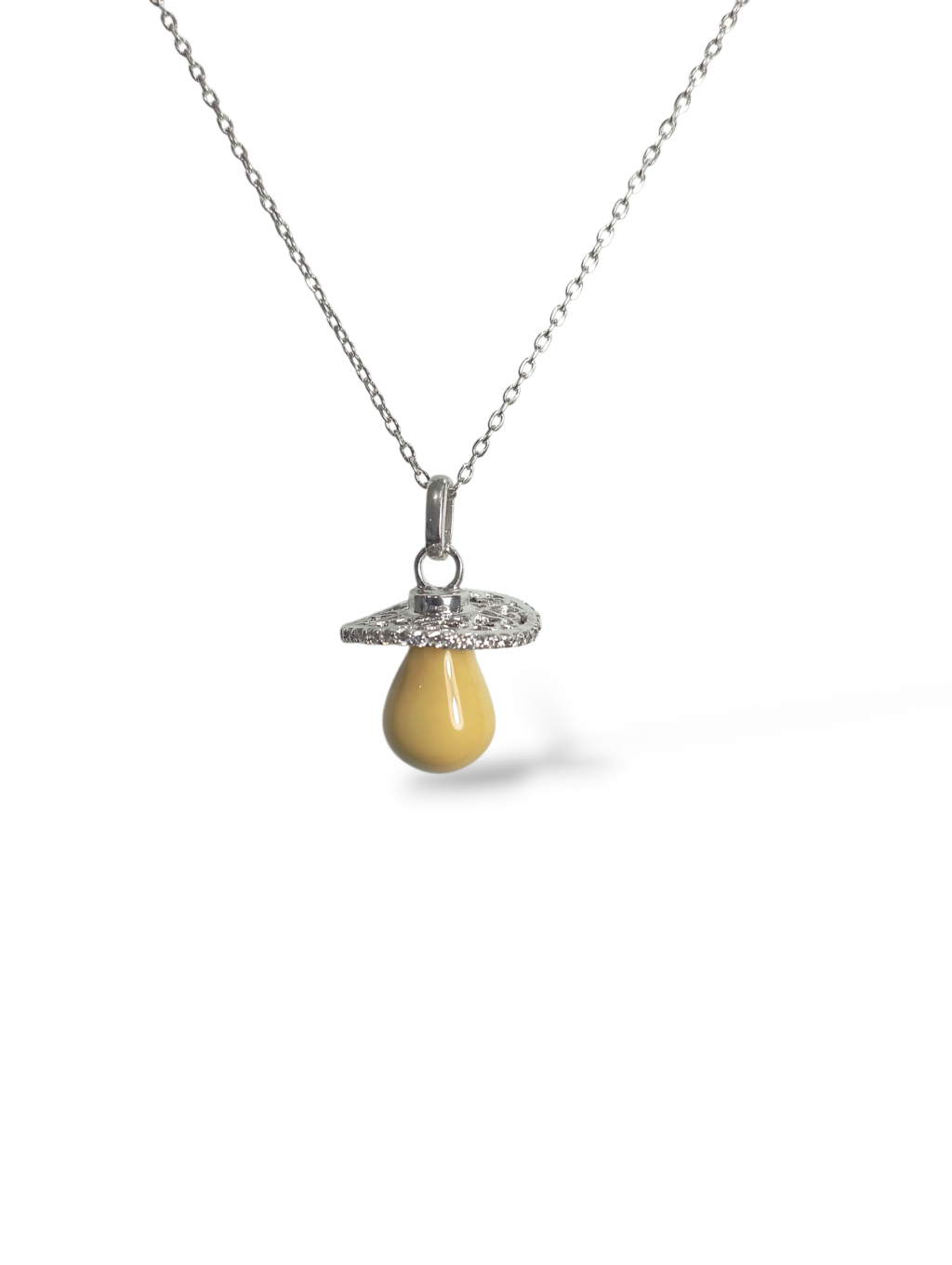 Collana ciuccio argento Bottega Oroblu, catenina e pendente in argento 925 placcato oro bianco 18 kt, ciondolo a forma di ciuccio smaltato giallo e zirconi bianchi incastonati, lunghezza ciondolo 2,5 cm compreso maglia, lunghezza collana 45 cm, confezione inclusa.