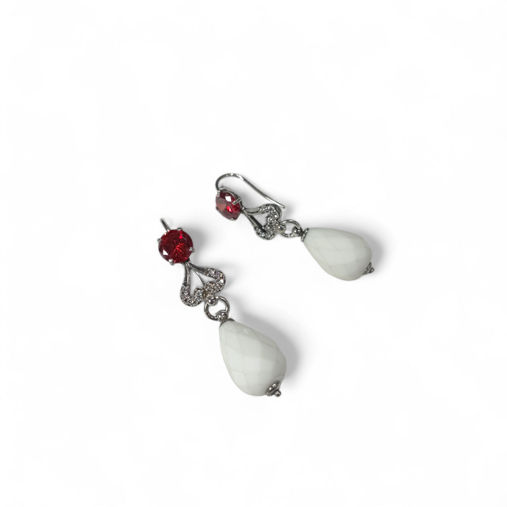 Orecchini agata argento Bottega Oroblu, orecchini in argento 925 mm placcato oro bianco 18 kt con pendente a goccia di agata bianca sfaccettata lunga 20 mm, zircone rotondo rosso Orange incastonato a griffe e zirconi bianchi incastonati su cuore, chiusura ad arco, confezione inclusa.
