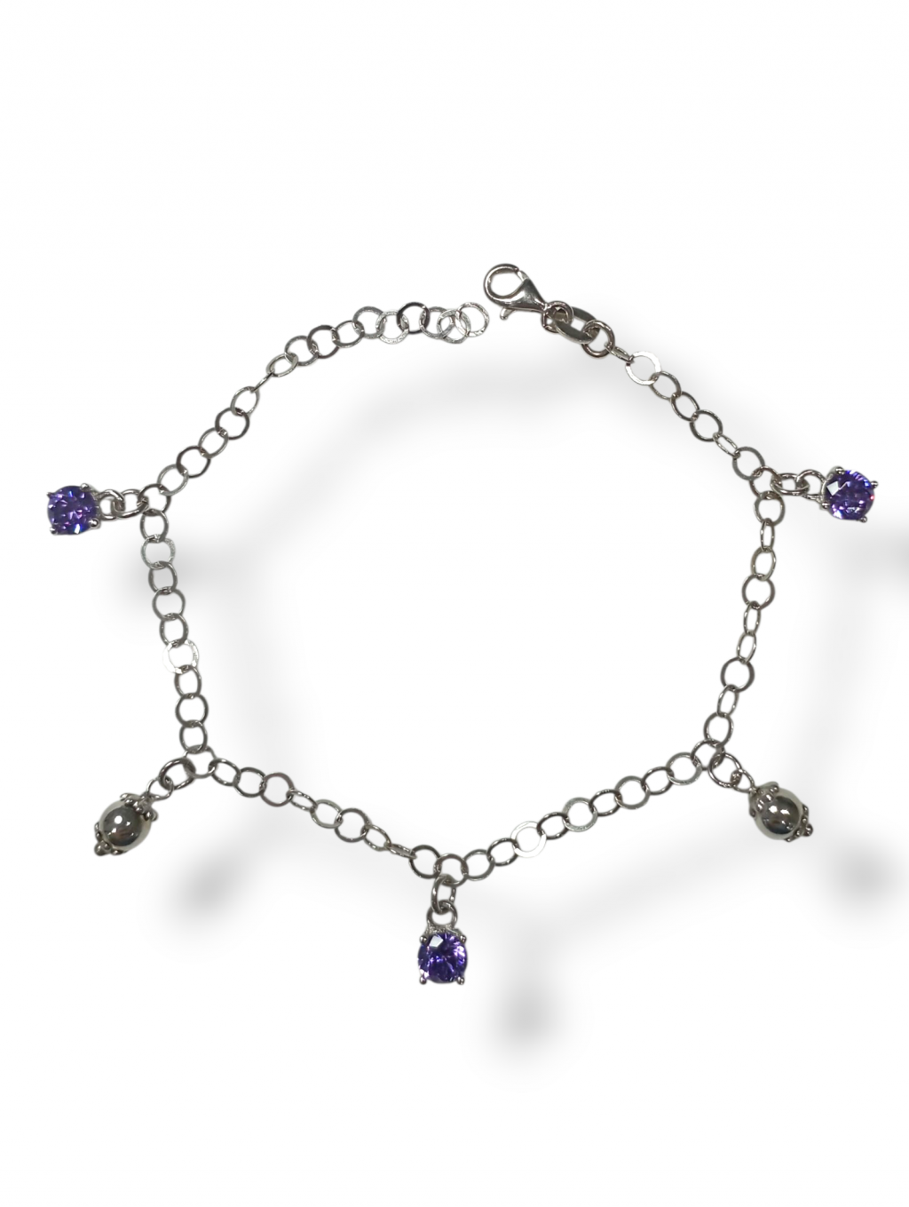 Bracciale donna argento viola Monnalisa jewels bracciale ina argento 925 placcato oro bianco 18 kt, pendenti a sfere con coppette e zirconi viola incastonati a griffe misura 5 mm, lunghezza bracciale 16/20 cm regolabile con regolatore a catena incluso, chiusura a moschettone, confezione inclusa.