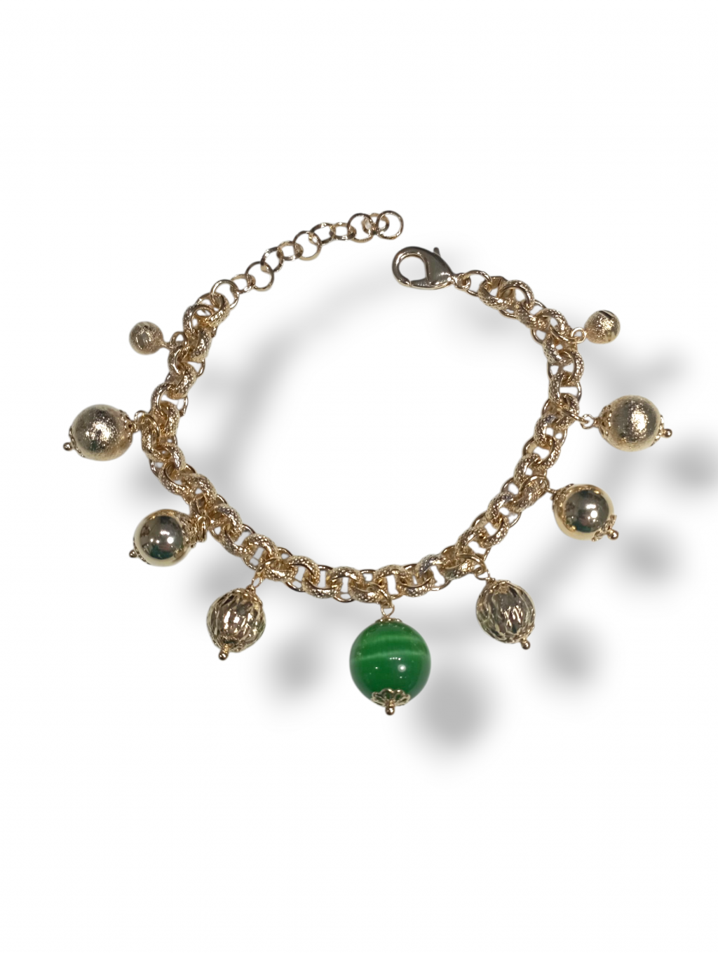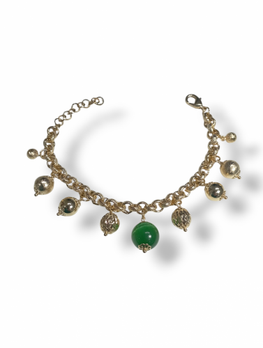 Bracciale donna I Think jewels agata verde, catena con pendenti sfere in bronzo placcato oro 18 kt satinate, lucide e sfaccettate, ciondolo centrale in agata verde 12 mm, chiusura con moschettone,lunghezza bracciale 18 cm allungabile fino a 21 cm con regolatore a catena incluso, confezione inclusa.