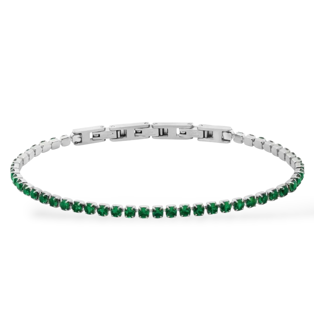 Bracciale tennis cristalli verdi Anyca jewels, bracciale in acciaio 316 l inossidabile e cristalli verdi incastonati di 2 mm, chiusura a scatto, lunghezza bracciale 17/19,50 cm regolabile tramite regolatore incluso, confezione inclusa.