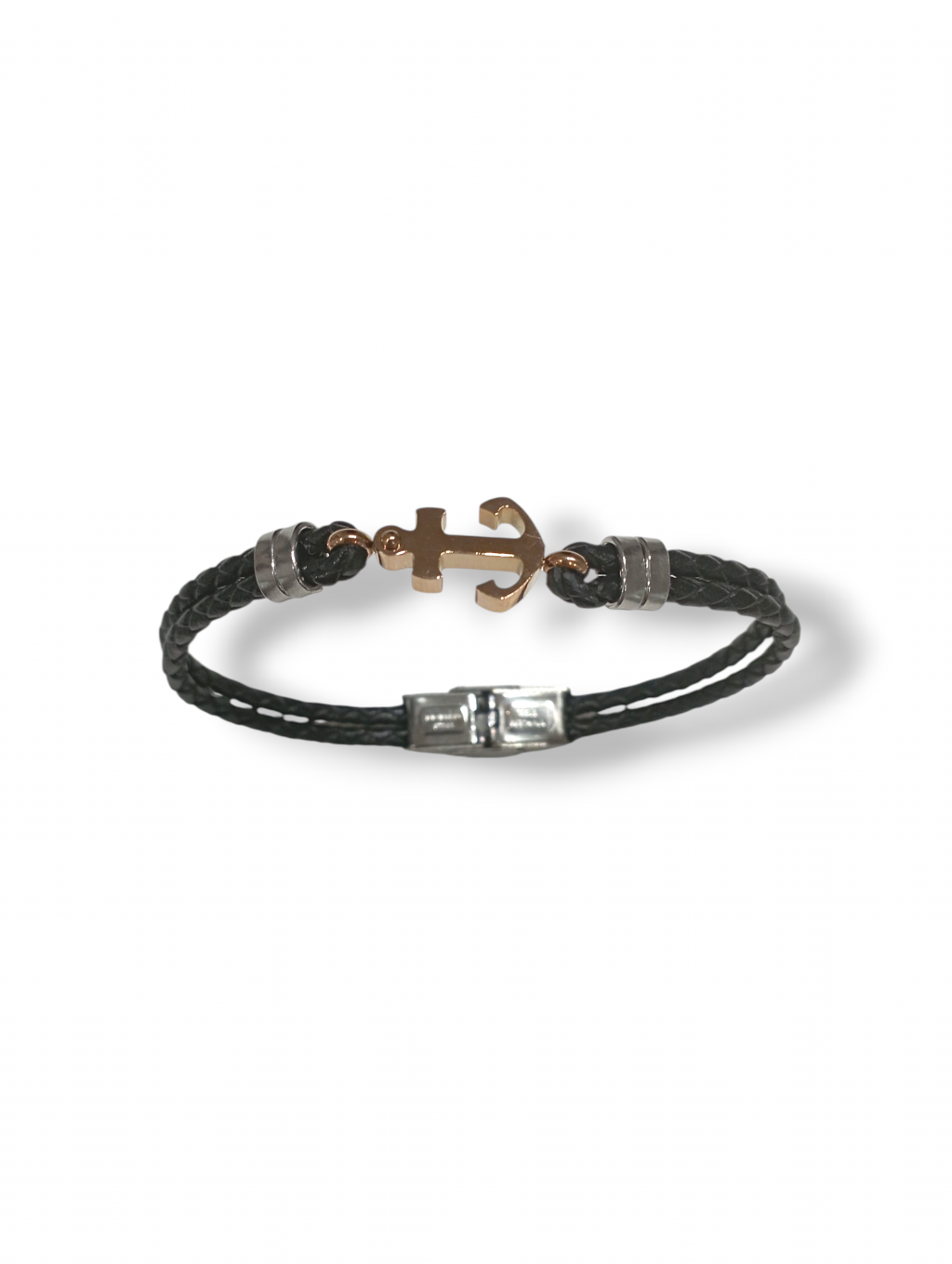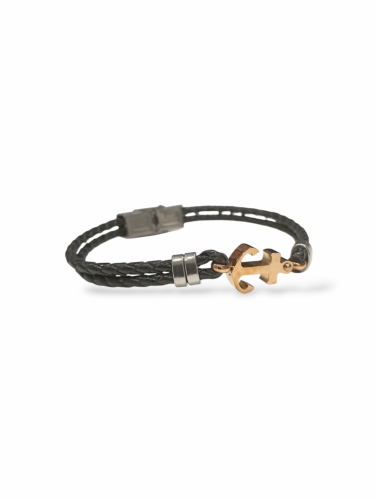Bracciale uomo ancora Anyca jewels, cinturino in doppio filo cuoio nero intrecciato, ancora centrale