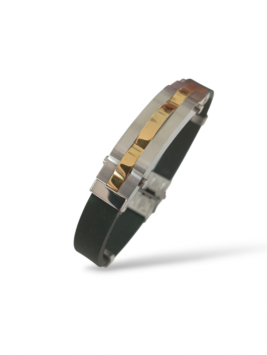 Bracciale uomo Anyca jewels, cinturino caucciù piatto di 10 mm, centrale bicolore in acciaio Placcato oro 18 kt, inserti laterali in acciaio, chiusura a scomparsa in acciaio, lunghezza bracciale 20,5 cm, accorciabile, confezione inclusa.