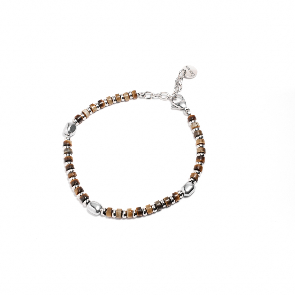 Bracciale uomo Gianvix Pebbles AC2091-D, rondelle e sassolini lucidi in acciaio 316l inossidabile e rondelle pietre occhio di tigre, lunghezza cm 19+3 regolabile tramite regolatore a catena incluso, chiusura a moschettone, confezione inclusa.