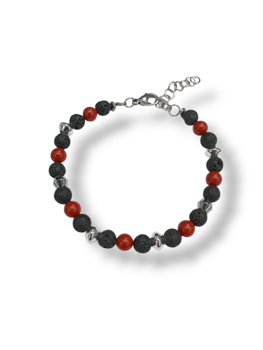 Bracciale uomo lavica corallo Anyca jewels, bracciale in acciaio e sfere in pietra lavica naturale 5,5 mm, corallo rosso 5 mm, distanziatori e dischi in acciaio inox, chiusura a moschettone, lunghezza bracciale cm 18, allungabile a cm 21 tramite regolatore a catena incluso, confezione inclusa.