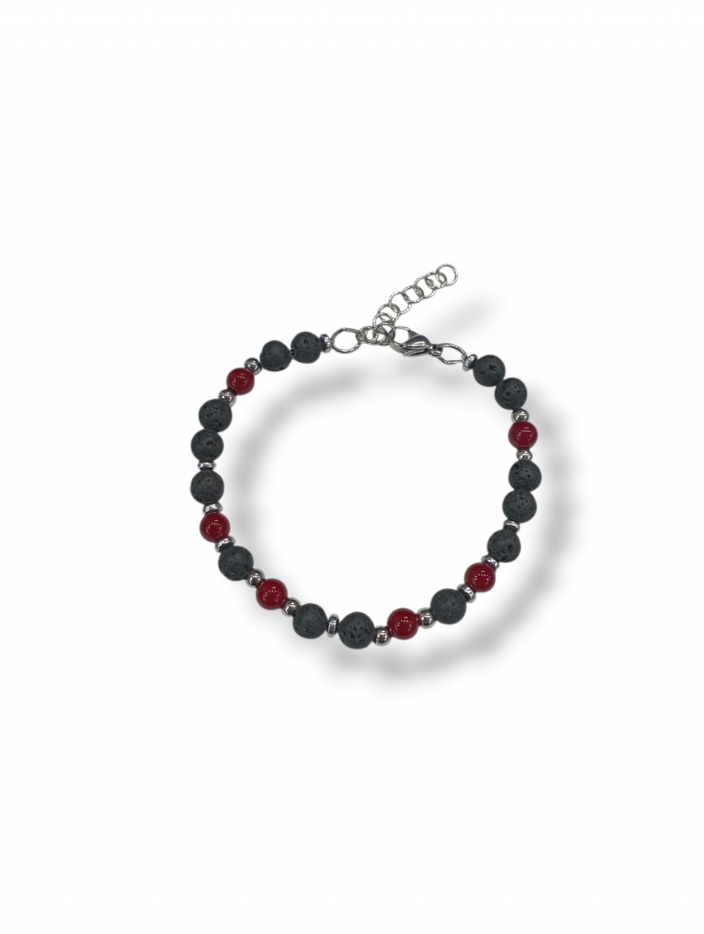 Bracciale uomo lavica corniola Anyca jewels, bracciale in acciaio e sfere di pietra lavica naturale di 5.5 mm, corniola di 5 mm e distanziatori di dischi e sfere in acciaio inox di 4 mm, chiusura a moschettone, lunghezza bracciale cm 18, allungabile a cm 21 tramite regolatore a catena incluso, confezione inclusa.