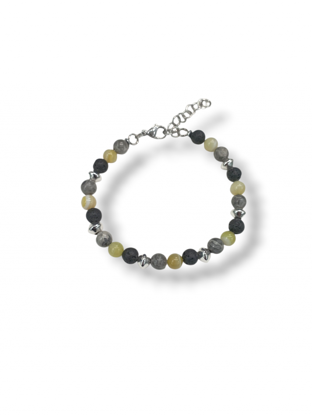 Bracciale uomo lavica granito Anyca jewels, bracciale in acciaio e sfere di pietra naturale 5,5 mm con distanziatori in acciaio, sfere di quarzi verde acido e granito, chiusura a moschettone, lunghezza bracciale cm18 allungabile a 21 cm tramite regolatore a catena incluso, confezione inclusa.