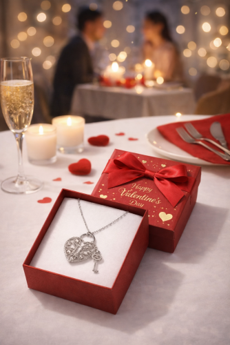 Incastonati, larghezza cuore circa 25 mm, lunghezza chiave circa 18 mm, collana a catena