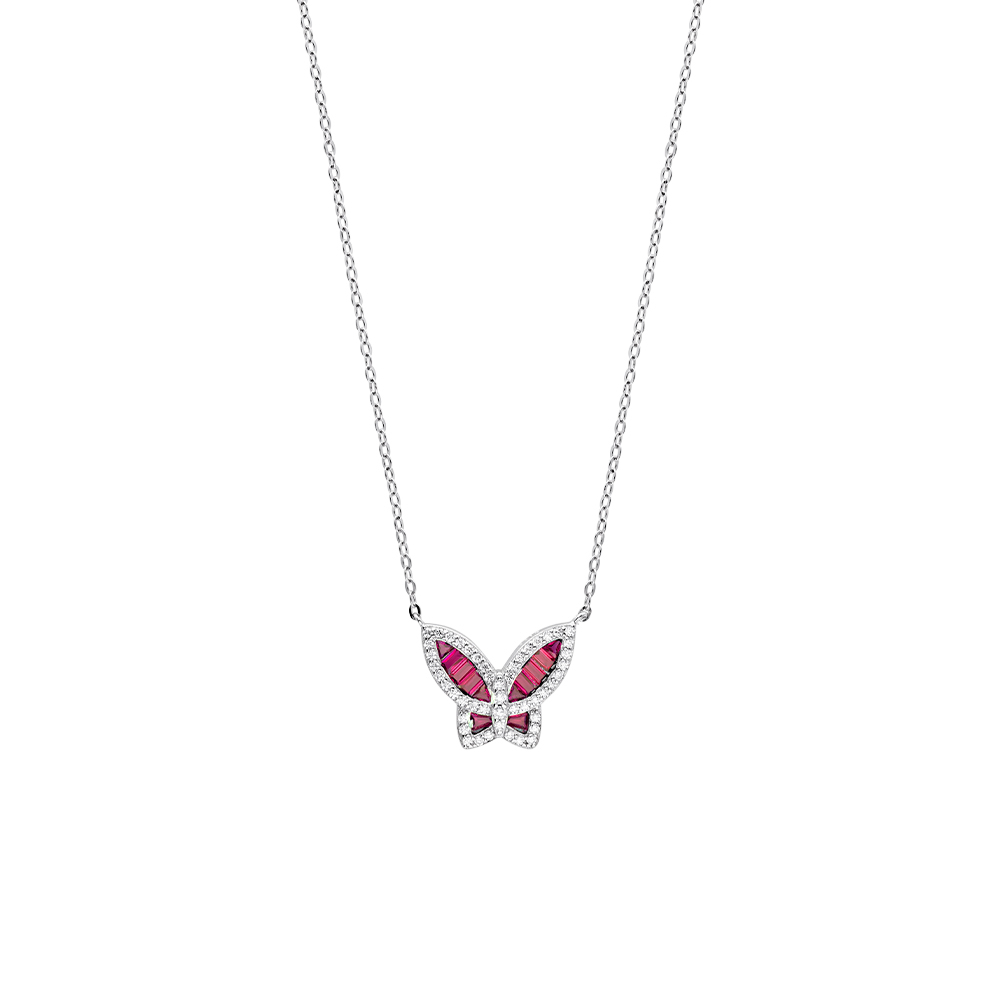 Collana donna for you jewels Essence N23008RB, catena e pendente a forma di farfalla in ottone Placcato oro bianco 18 kt, cristalli bianchi e cristalli rettangolari rossi, lunghezza collana cm 42 + 5 cm di estensione, chiusura a moschettone, confezione inclusa.