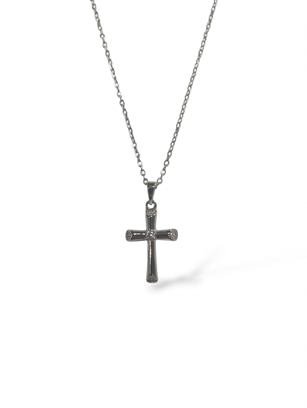 Collana uomo croce cristalli Anyca jewels, calena e pendente a forma di croce in acciaio 316l inossidabile, 5 cristalli bianchi rotondi incastonati, lunghezza croce cm 2,80, lunghezza collana 40/47 cm regolabile con regolatore a catena incluso, confezione inclusa.