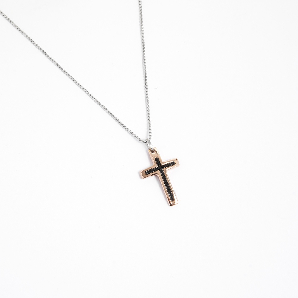 Collana croce uomo Gianvix Cross2 AC2002-A, catena e pendente a forma di croce in acciaio 316l placcato oro rosa 18 kt con cristalli neri, chiusura a moschettone lunghezza cm 45/50 regolabile tramite regolatore incluso, confezione inclusa.