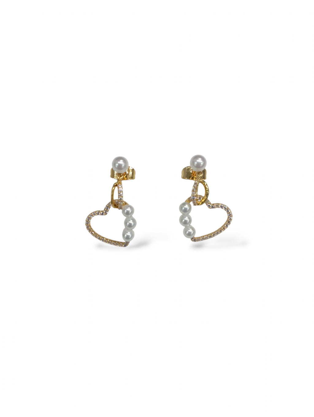 Orecchini cuore perle For You jewels, pendenti a forma di cuore in ottone Placcato oro giallo 18 kt con tre perline di 3 mm e una di 4 mm centrale, cristalli bianchi incastonati, chiusura a farfalla, confezione inclusa.