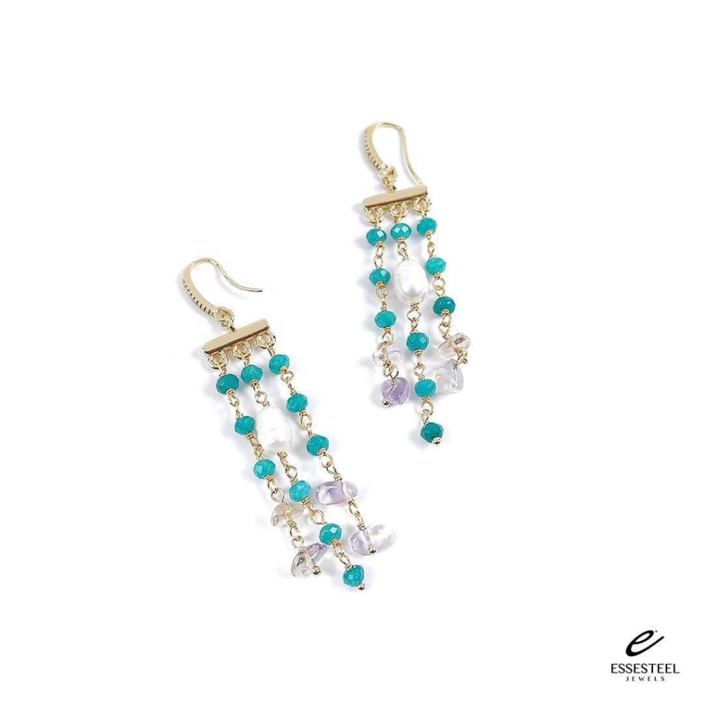 Orecchini Essesteel jewels prasiolite, orecchini in bronzo placcato oro 18 kt, con pietre prasiolite sfaccettata, perle fiume,, quarzi rosa e ametista, cristalli bianchi, lunghezza orecchini 8cm circa, confezione inclusa.