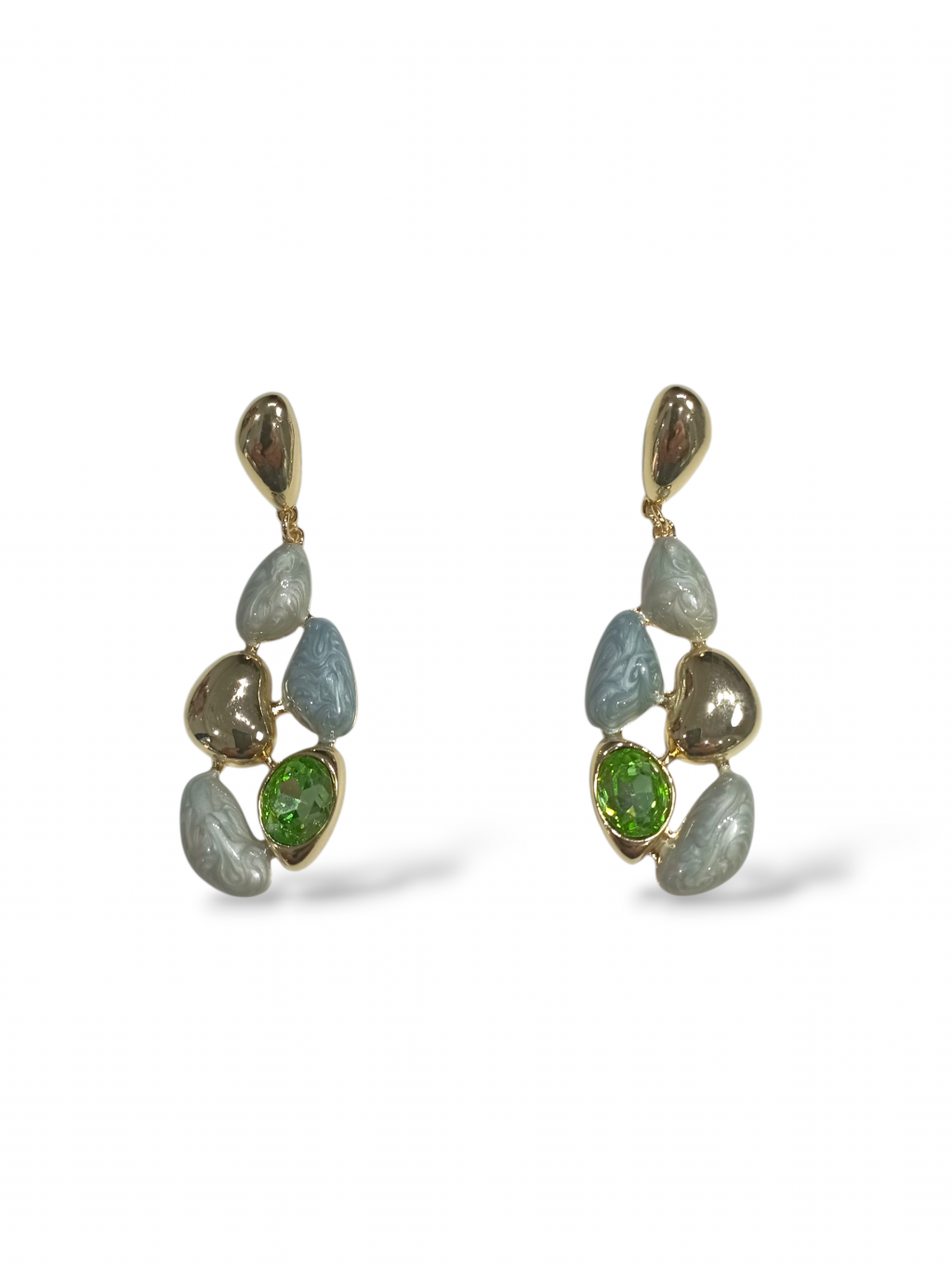 Orecchini Essesteel jewels smalti zirconi verde, orecchini in bronzo placcato oro 18kt, smalto verde chiaro satinato chiaro scuro, zircone verde ovale, lunghezza orecchino 6 cm, chiusura a pressione, confezione inclusa.