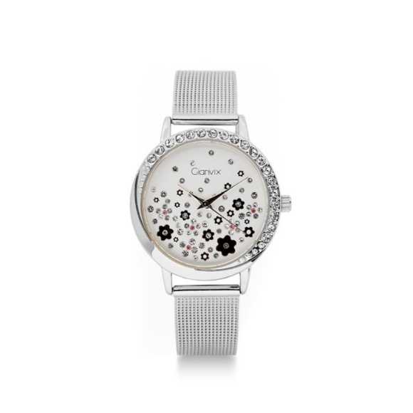 Orologio donna Gianvix Flower GX328-A, movimento al quarzo,cassa in metallo 36 mm, corona a pressione, lunetta con cristalli bianchi, quadrante silver con fiorellini e cristalli, bracciale Milano in acciaio con chiusura a scatto, cinturino regolabile con scorritore, 2 anni di garanzia.