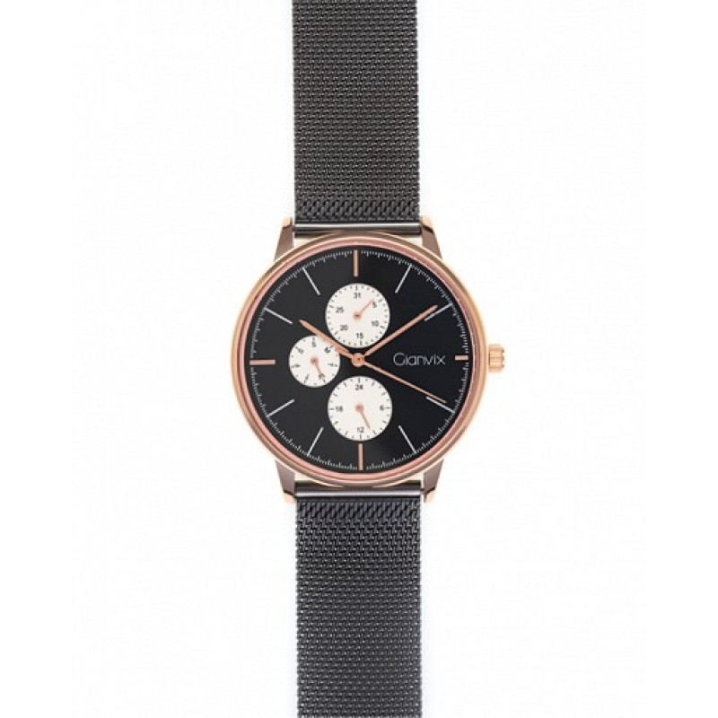 Orologio uomo Gianvix Berlino GX316-C, movimento al quarzo, Cassa in acciaio colore rosa diametro 40 mm, quadrante nero con sfere e indici colore rosa, funzione giorno settimana, mese, formato 24 ore, bracciale in acciaio brunito modello Milano, chiusura a scatto e cinturino regolabile, 2 anni di garanzia.