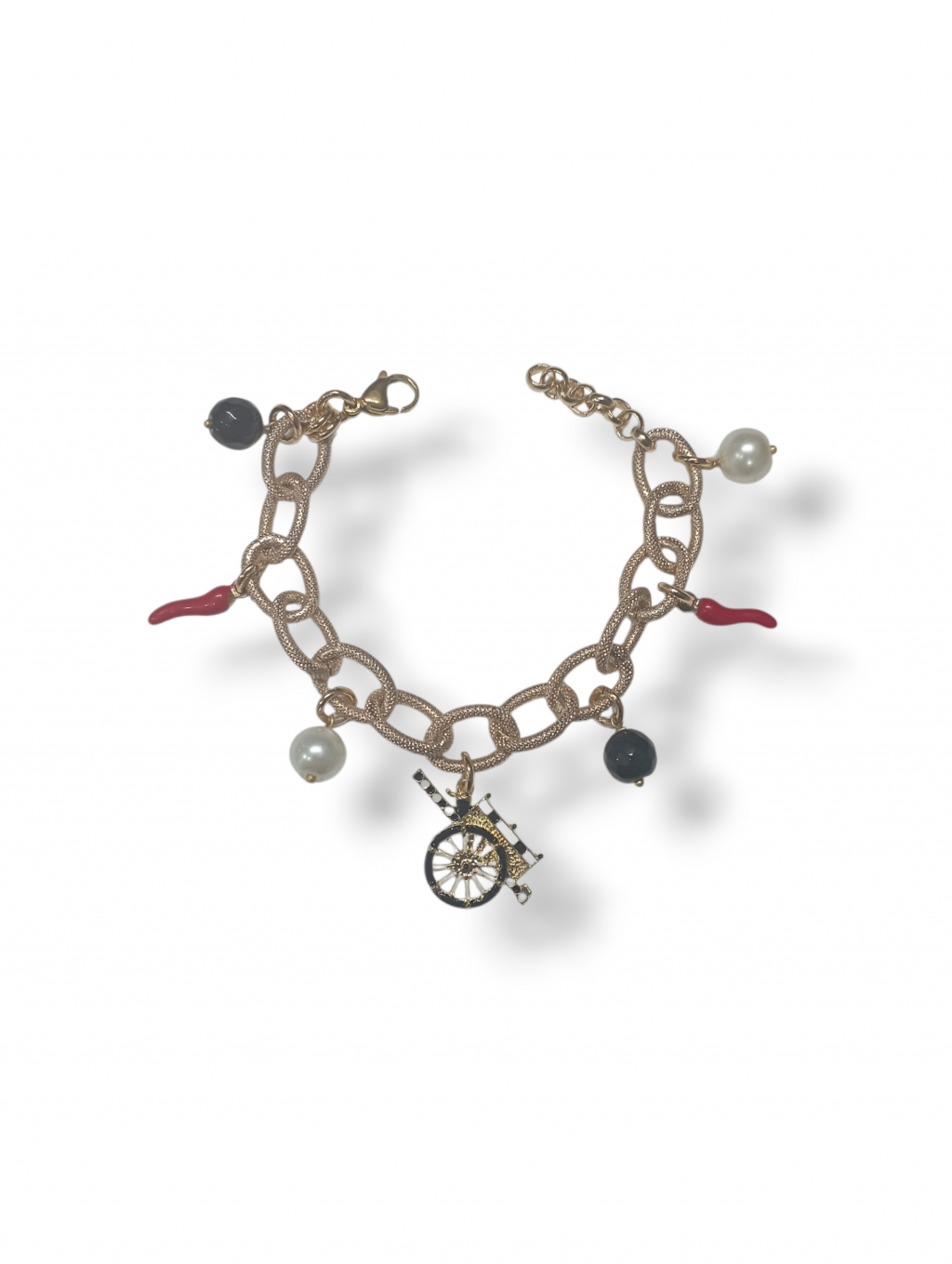 Bracciale Sicilian jewels carretto nero, catena in ottone Placcato oro giallo 18 kt, centrale carretto siciliano con smalti bianco e neri, pendenti di perle e onice nero sfaccettato con cornetti rossi, chiusura a moschettone, lunghezza cm 18/21 regolabile tramite regolatore a catena incluso, confezione inclusa.