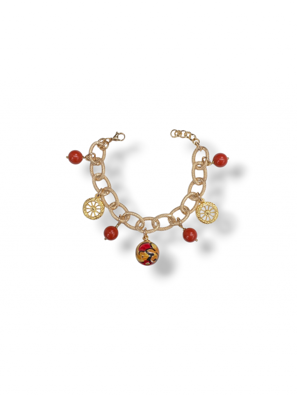 Bracciale Sicilian jewels ruote carretto siciliano corallo, catena in ottone Placcato oro giallo 18 kt, pendente centrale sfera ceramica dipinta a mano, ciondoli a forma di ruota carro siciliano con lavorazione martellata, sfere di corallo 9 mm, chiusura a moschettone, lunghezza cm 18/21 regolabile tramite regolatore a catena incluso, confezione inclusa.
