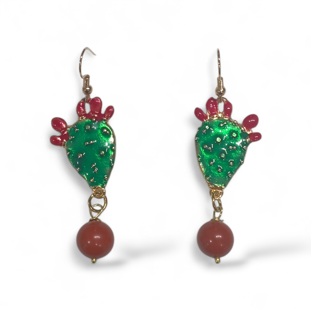 Orecchini fichi d'india corallo Sicilian Jewels, pendenti a forma di fichi d'india in bronzo placcato oro 18 kt e sfera di corallo rosso salmonato, chiusure ad arco, lunghezza orecchini 6 cm, confezione inclusa.
